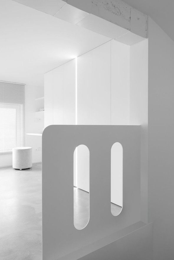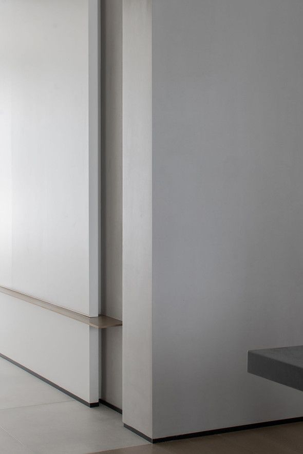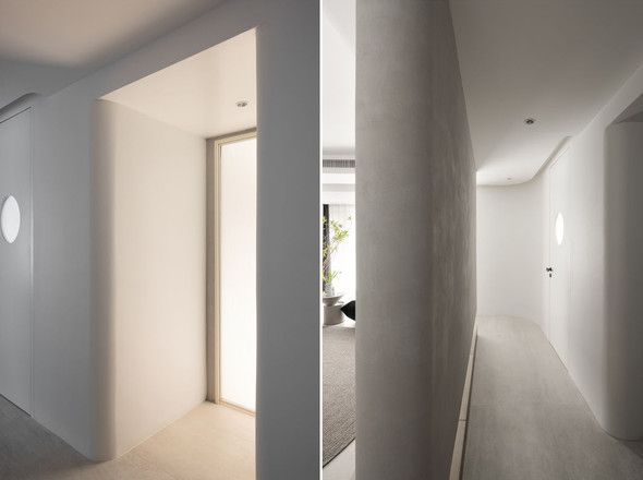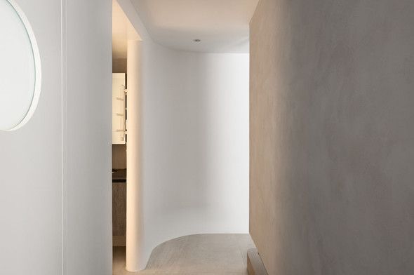圖/東己壤設(shè)計(jì)研究室 走廊隱藏式踢腳線(xiàn)和弧形墻角的工藝,妥帖的處理了墻面與地面的交互。界面轉(zhuǎn)折的連貫性,讓有限的空間產(chǎn)生無(wú)限的尺度。