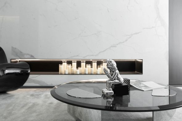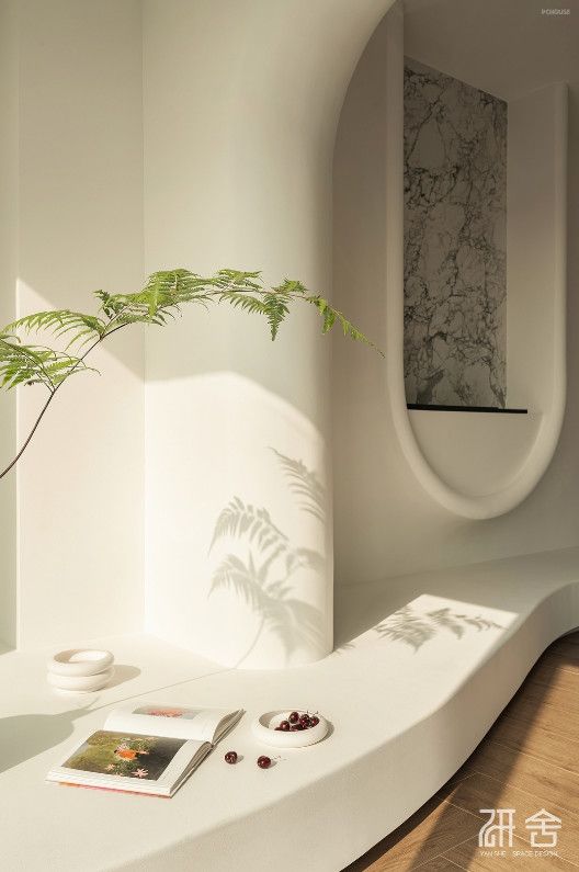 圖/研舍設(shè)計(jì) 比如以下這套90后姑娘的房子,設(shè)計(jì)師將奢華進(jìn)行了精致的提取,同時(shí)保證了她的生活的極致舒適。 客廳舍棄了屋主不常用的電視,留下來(lái)是一大片自然的紋理,漂亮的理石紋路連貫并富有張力,下方的壁龕擺放的微光蠟燭,成為溫馨的一筆。
