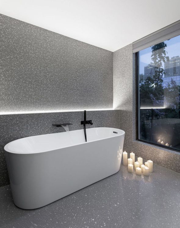 圖/柒筑空間設(shè)計(jì)有限公司 衛(wèi)浴空間大量采用水磨石材質(zhì),細(xì)膩的紋路仿佛懸浮著的星光,與其共處的其他材質(zhì)平衡的剛剛好,仿佛在共曲一篇樂(lè)章。