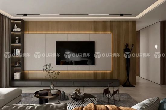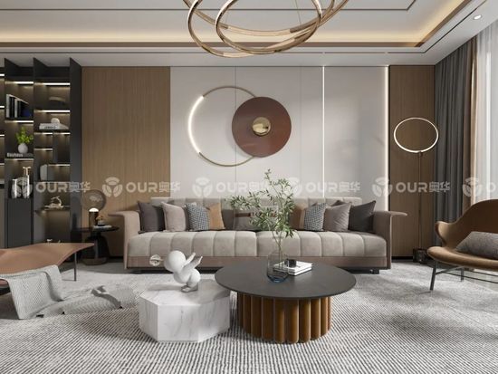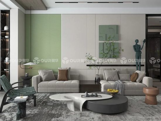 奧華松綠背景墻+布拉格皮紋,清雅的灰調(diào),在蜿蜒在綠意中,為客廳舒展出一種靜謐的高級感,用精致的細(xì)節(jié)之美,演繹美妙休閑時光,讓笑聲伴著家人回憶更多幸福時光。