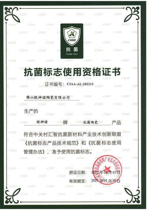 CIAA抗菌標(biāo)志,消費(fèi)者信賴之選 CIAA是由國(guó)家民政部批復(fù)成立,具有國(guó)際影響力的中國(guó)抗菌行業(yè)組織。為了向社會(huì)推廣安全且有效的抗菌產(chǎn)品,CIAA建立了嚴(yán)格的技術(shù)授權(quán)標(biāo)準(zhǔn),對(duì)企業(yè)資質(zhì)、產(chǎn)品技術(shù)、抗菌功能的標(biāo)注都有嚴(yán)格要求,并制定出對(duì)抗菌產(chǎn)品的衛(wèi)生安全性能和抗菌性能進(jìn)行評(píng)價(jià)的技術(shù)標(biāo)準(zhǔn),并基于該技術(shù)標(biāo)準(zhǔn)開發(fā)出抗菌標(biāo)志,專業(yè)性和權(quán)威性受到社會(huì)及建陶行業(yè)廣泛認(rèn)可。
