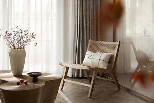 如清晨的一句“早安”,空間的初見,是安于一日三餐的用餐空間。光與這里的一切自然融入,勾勒出對日常生活的珍視。 起居活動空間,與餐廳互為對話。坐在這里,不疾不徐等待清晨到來,再現(xiàn)了留存在我們心里讓人舒適的情境。八點(diǎn),光的疊加,一切褪去了涼意,也在帶動整個居所質(zhì)樸的觸動。我們用了觸感溫和的材質(zhì)如棉、麻、木,希望給生活帶去溫暖。設(shè)計取自大自然又還予生活本真。