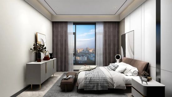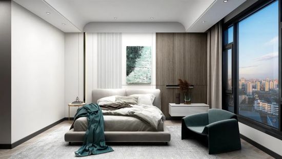 ▲TE017-5 主臥用乳白色的墻布和棕色墻板相結(jié)合,搭配周圍的軟裝布置,營造出了一種安逸、靜謐的居住環(huán)境。擺放在兩側(cè)的藝術(shù)臺燈,讓簡約的空間增加了一絲藝術(shù)氣息。