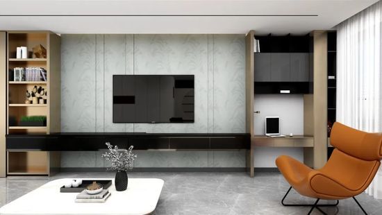 ▲JC027-2 客廳的設(shè)計同時考慮到了美觀性和實用性。電視柜懸空,清掃起來更方便。背景墻兩側(cè)做收納的同時做了一個小辦公臺。吊頂采用燈帶的手法,把現(xiàn)代風(fēng)格的元素融入進(jìn)去。