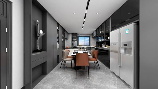 ▲B05-2 餐廳和廚房采用了當(dāng)下流行的開放式布局。兩側(cè)墻面收納空間充足,質(zhì)樸天然的石材地磚、干練簡約的餐桌,圈畫出理性卻不乏溫馨的用餐空間。