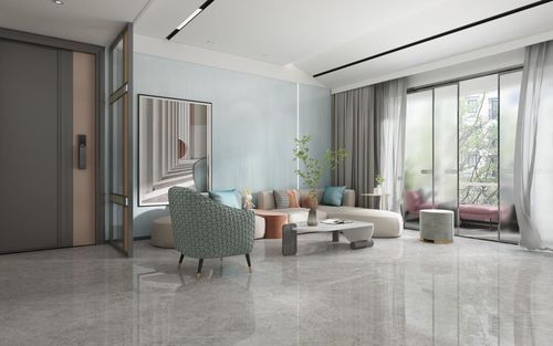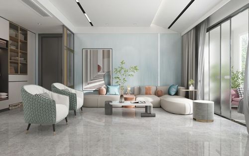 客廳空間 客廳選擇清新自然的春夏色彩。以素雅的淡藍(lán)色巖板作為背景墻,營(yíng)造空間亮點(diǎn)所在,搭配簡(jiǎn)單的灰色大理石瓷磚,碰撞出別樣的家居風(fēng)情。適當(dāng)加入橙色、綠色等莫蘭迪元素,讓整體配色更顯雅致高級(jí),營(yíng)造寬敞明亮、舒適大方的客廳空間。 橘色+灰色,個(gè)性鮮明