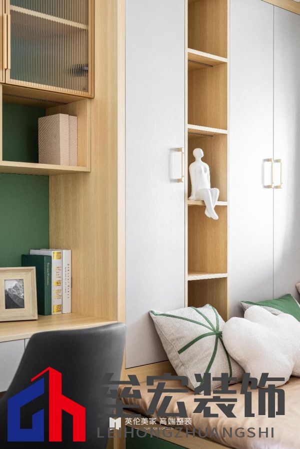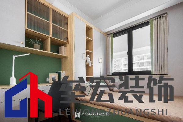 另一個兒子房空間整體的顏色以原木色和青草綠為基調,主做榻榻米設計,底部留有超多收納空間,與定制書桌搭配和諧,讓臥室不再單調,滿足學習和休息要求,室內整體和諧。