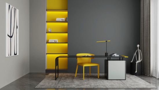 沉靜的破繭色盤是高級(jí)灰色系,寓意著生命在歷經(jīng)蛻變后的蘇醒和突破,極易讓人聯(lián)想到堅(jiān)韌的生命力,運(yùn)用于書房中再合適不過。再于其中增加一抹碎金黃,沉穩(wěn)的空間中,又多了一絲生活的靈動(dòng)和鮮活,寧?kù)o平和、適合沉思的現(xiàn)代書房便躍然于視野之中。