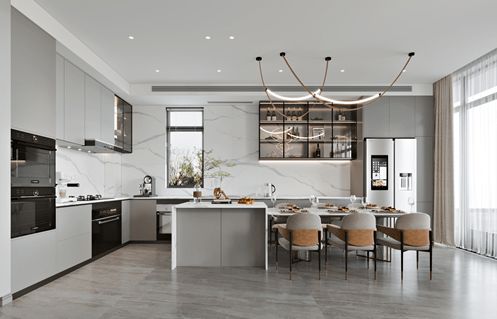 出則繁華,入則寧?kù)o。當(dāng)下都市的喧囂,難得覓一方清凈。在某些時(shí)候人們總是渴望回歸自然,或臨近于海邊;或?qū)ひ环角逖旁鹤樱韵砬鍍簟?/p> 客廳6.3M挑空的結(jié)構(gòu),讓整個(gè)視野格外開(kāi)闊,薄紗下的大開(kāi)間隔斷門(mén)讓整個(gè)采光灑在客廳對(duì)的沙發(fā)上,清透春日暖陽(yáng),分外心情舒暢。一組米灰色的沙發(fā)、水墨石材茶幾、點(diǎn)睛如青黛,于花園的景致構(gòu)成一片遠(yuǎn)山近景。高視闊步,層級(jí)遞進(jìn)的藝術(shù)水晶燈更加襯托了雍容。在電視背景設(shè)計(jì)的時(shí)候,精心打造了鋁材鋼板柜開(kāi)放空間,可增加點(diǎn)線面的結(jié)合,金屬元素于幾何線條僅是空間藝術(shù)的組成部分,也成為了設(shè)計(jì)語(yǔ)言和情感的表達(dá)媒介。 大概領(lǐng)略過(guò)精妙絕倫的自然風(fēng)景,便不會(huì)放過(guò)任何一個(gè)可以欣賞風(fēng)景對(duì)的角落,3層的品茗區(qū)在引景的手法上得到了充分的運(yùn)用。品茗區(qū)內(nèi)利用原有的結(jié)構(gòu)特點(diǎn)結(jié)合整面墻的書(shū)柜做出了一個(gè)洗手間以及茶水區(qū),暗門(mén)的運(yùn)用讓整個(gè)空間顯得合理且美觀。地面采用大面積的白色的山水紋理的巖板,山水畫(huà)簾濃淡相宜,詩(shī)書(shū)畫(huà)卷自成風(fēng)雅。一壺清茶,幾席茶座,清風(fēng)徐來(lái),亦是精神之歸處。