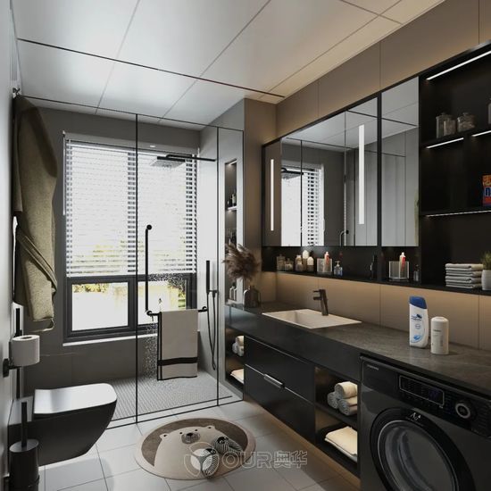 顛覆思維 實(shí)現(xiàn)隱形取暖 奧華天境中央暖空調(diào),推翻既有認(rèn)知和經(jīng)驗(yàn)去追溯吊頂設(shè)計(jì)的初心本源,在取暖器的功率、換氣量等基礎(chǔ)功能上,更強(qiáng)調(diào)電器的裝飾美學(xué)功能。設(shè)計(jì)語(yǔ)言上發(fā)揮顛覆性思維,改變?nèi)∨鞯耐庑?,配合無邊框大尺寸板材,將浴室取暖器融入到頂部空間,真正做到了隱形取暖,不打擾的溫暖。