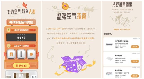 互動贏福利,品牌口碑提升 作為本次活動的合作品牌,卡薩帝空調(diào)準(zhǔn)備了超多驚喜福利。上小紅書搜索#軟乎乎的溫柔風(fēng) ,點(diǎn)擊進(jìn)入活動H5即可獲取隨機(jī)場景搭配。完成每日打卡、瀏覽相關(guān)話題、分享話題頁等任務(wù)獲取積分即可兌換產(chǎn)品,操作簡單,獎品豐厚,極大調(diào)動了用戶參與的積極性。助力品牌拉新引流,品牌口碑、品牌種草力得到進(jìn)一步提升。