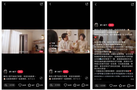 值得一提的是,卡薩帝空調(diào)曾多次合作「歡迎光臨我的家」IP,它深刻洞察了年輕人的消費(fèi)理念和家裝愛好,引發(fā)用戶對“舒適空氣”的情緒共鳴,激發(fā)無數(shù)熱愛生活的年輕人創(chuàng)想理想生活方式。此次「軟乎乎的溫柔風(fēng)」活動數(shù)據(jù)亮眼,截止活動收官累計(jì)收獲近7800萬次的總曝光,話題頁總瀏覽量達(dá)1020萬,產(chǎn)出優(yōu)質(zhì)筆記5800篇。通過線上-線下聯(lián)動種草,打造沉浸式互動體驗(yàn),完成千萬級的營銷傳播。 “家訪”微綜藝,KOL雙視角種草產(chǎn)品 本次「軟乎乎的溫柔風(fēng)」活動以博主@蘿卜樹下 和@秋姨ChillCool 的兩支vlog開啟,雙重視角多維度闡述卡薩帝星云空調(diào)產(chǎn)品賣點(diǎn),邀請2億小紅薯發(fā)布靈感筆記。視頻中@秋姨ChillCool 受邀做客@蘿卜樹下 的家,暖色調(diào)慢節(jié)奏的視頻帶用戶感受他們的理想生活,真實(shí)地分享了卡薩帝星云空調(diào)的使用感受。 @蘿卜樹下 是一對新手寶爸寶媽,對空氣質(zhì)量的要求不僅是健康干凈,同時(shí)還對舒適感要求頗高,而卡薩帝星云空調(diào)將硬核高能空氣機(jī)與溫柔軟風(fēng)科技完美結(jié)合,形成強(qiáng)烈的記憶反差感,很好地解決了他們的需求。從情緒價(jià)值上引發(fā)垂類人群的共鳴,達(dá)到種草目的。