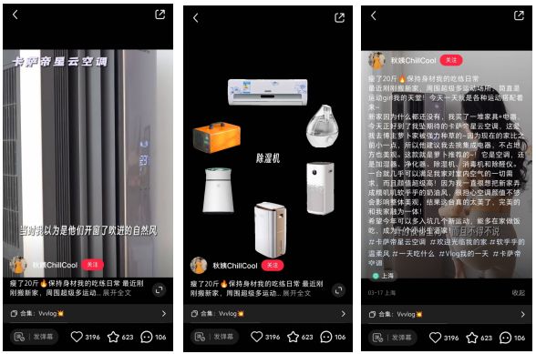 而作為@蘿卜樹下 視頻的共創(chuàng)者,@秋姨ChiilCool 視角則更全面直接地剖析了卡薩帝星云空調(diào)的優(yōu)點(diǎn)——復(fù)合軟風(fēng),又軟又健康。作為一個(gè)健康自律的健身博主秋姨對空氣質(zhì)量有著高標(biāo)準(zhǔn)高要求,視頻為做客@蘿卜樹下 家的后續(xù),也更具有真實(shí)性。視頻中著重強(qiáng)調(diào)了卡薩帝空調(diào)是集空調(diào)、加濕器、凈化器、除濕機(jī)、消毒機(jī)、除甲醛機(jī)于一體的全能型智能產(chǎn)品,從實(shí)用功能角度切入完成產(chǎn)品種草。