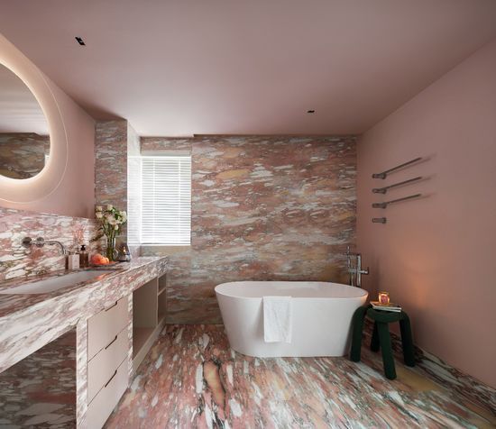 設(shè)計(jì)回歸需求 空間不被限制 “我喜歡在衛(wèi)生間喝咖啡。”柯沅伽語出驚人,但是當(dāng)你看到她的衛(wèi)浴間時(shí)便能完全理解。,這個(gè)以小眾大理石挪威紅和防水乳膠漆搭配打造的粉色獨(dú)立衛(wèi)浴空間,獨(dú)特而不張揚(yáng)、清爽又夢幻。衛(wèi)生間秉持三分離功能特點(diǎn),不僅貌美,還兼具實(shí)用性。超寬的洗漱臺面可以安置她喜愛的各式香薰蠟燭與日常洗護(hù)用品。在獨(dú)享洗浴時(shí)能喝上一杯紅酒,泡澡時(shí)的閱讀都讓放松感油然而生。
