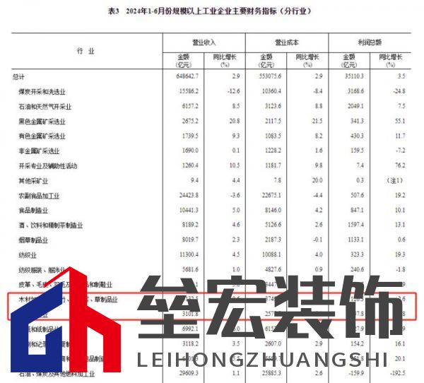 | 7月27日,國家統(tǒng)計局發(fā)布2024年上半年全國規(guī)模以上工業(yè)企業(yè)運行情況。 數(shù)據(jù)顯示,1—6月份,全國規(guī)模以上工業(yè)企業(yè)實現(xiàn)利潤總額35110.3億元,同比增長3.5%;營業(yè)收入64.86萬億元,同比增長2.9%;營業(yè)收入利潤率為5.41%,同比提高0.03個百分點。 分行業(yè)看,泛家居行業(yè)方面,1—6月份,全國家具制造業(yè)規(guī)模以上工業(yè)企業(yè)實現(xiàn)營業(yè)收入3101.8億元,同比增長5%;實現(xiàn)利潤總額137.8億元,同比增長3.8%。 1—6月份,全國木材加工和木、竹、藤、棕、草制品業(yè)規(guī)模以上工業(yè)企業(yè)實現(xiàn)營業(yè)收入4132.5億元,同比下降0.6%;實現(xiàn)利潤總額126.3億元,同比增長2.6%。