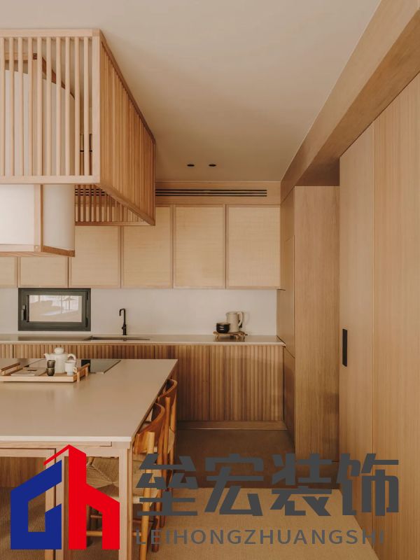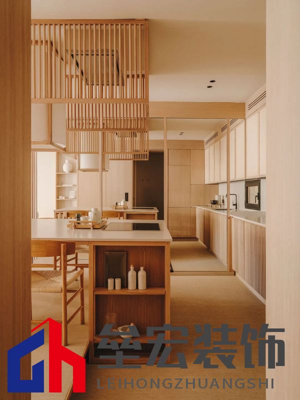 開(kāi)放式廚房設(shè)計(jì)簡(jiǎn)潔而高效,強(qiáng)調(diào)實(shí)用性與美觀的結(jié)合。自然木材料的使用增強(qiáng)了溫馨感,提供一個(gè)舒適的烹飪環(huán)境。