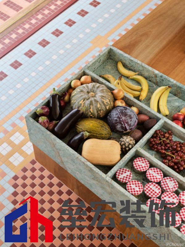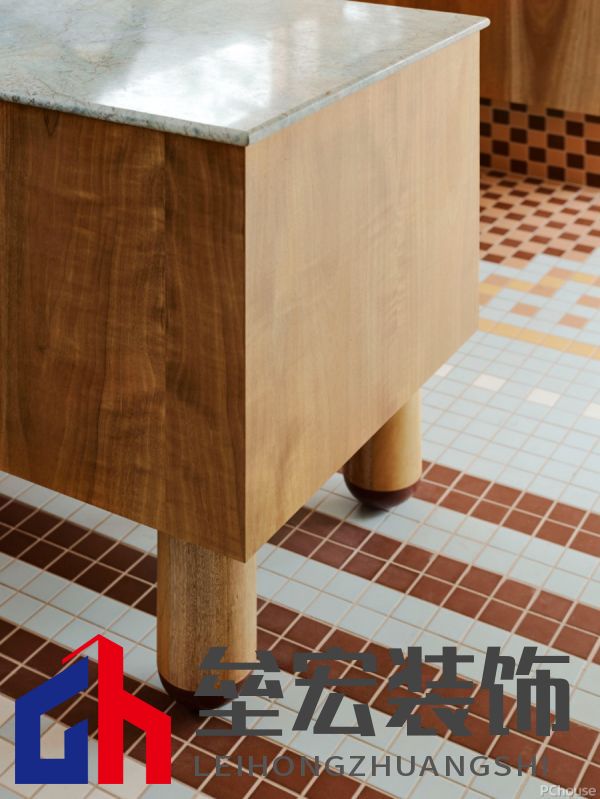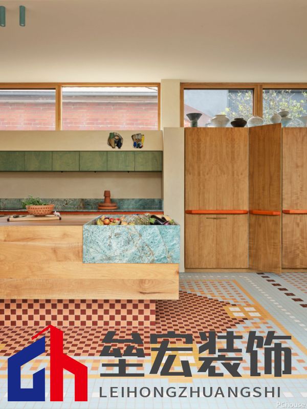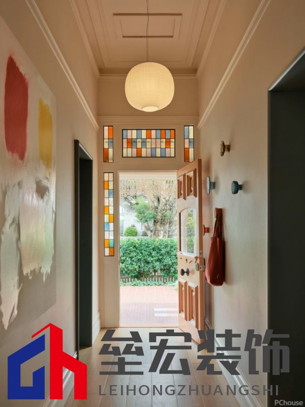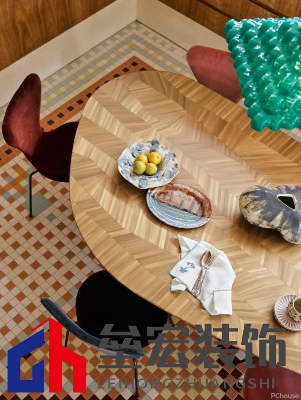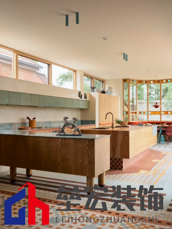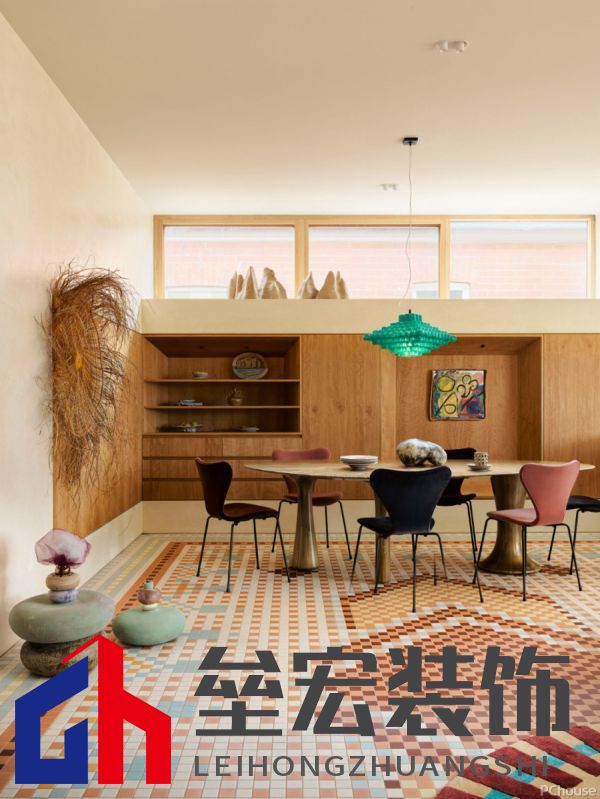 玄關是進入住宅的第一印象,也是這所房子風格的初步展示。入口處寶石色的鉛燈玻璃成為設計中的亮點,賦予空間一種濃郁的異國情調(diào),并且將視覺線條引向后方擴建部分。瓷磚圖案借鑒了波斯地毯的設計,形成了一塊具有像素化效果的“地毯”,通過材料和圖案的創(chuàng)新將新舊空間連接起來,同時預示著房屋內(nèi)其他區(qū)域豐富的幾何細節(jié)。