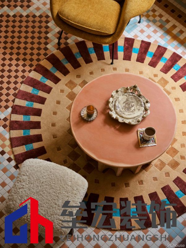 夏季客廳為了增強對比,設計師選擇了姜黃色的窗簾,并在地毯上引入了抽象幾何圖案,與整個住宅的設計語言一致。