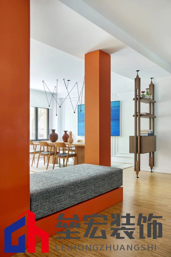 邊界元素。串聯(lián)空間,展現(xiàn)獨(dú)立魅力。設(shè)計(jì)工作室打造的紅色躺椅,以及背景中Cassina的Infinito書(shū)架,緊鄰餐廳區(qū)域。Mosso品牌的工業(yè)竹地板提供了中性背景和空間連續(xù)性。