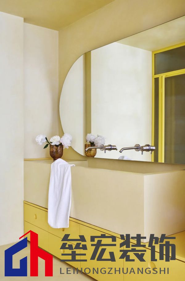 樂(lè)觀的空間。黃色的微水泥涂層、支撐在漆器容器和家具上的工藝水槽,或是同色系的隔板,都讓浴室充滿了正能量?;⌒午R子打破了直線條的單一性,增加了活力。