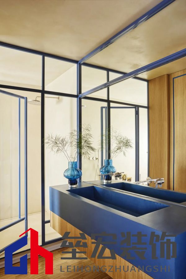 浴室,隔板和低矮的洗臉盆形成鮮明對(duì)比,介于海軍藍(lán)和克萊因藍(lán)之間的藍(lán)色,與條紋木相結(jié)合,帶來(lái)優(yōu)雅的“觸感”。