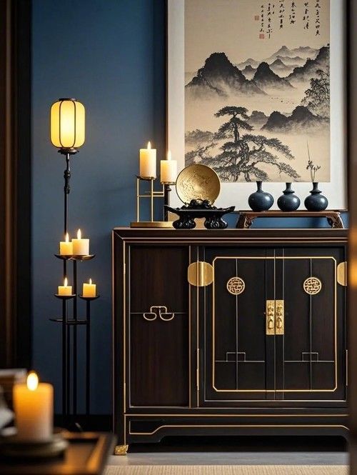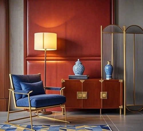 03 藍(lán)色 藍(lán)色作為中國傳統(tǒng)色彩中的重要一員,象征著深邃與寧靜的廣闊,猶如五行之水般潤物無聲,滋養(yǎng)心靈。藍(lán)色不僅是智慧與和平的象征,更代表深遠(yuǎn)與純凈,同時(shí)也是清新與希望的體現(xiàn)。 在室內(nèi)裝修中,讓沉穩(wěn)大氣的深藍(lán)色作為墻面,經(jīng)典復(fù)古的黑色壁柜,金色則應(yīng)用于裝飾線條或燈具。三者巧妙融合,把空間調(diào)和得生動而有力,增加沉穩(wěn)和寧靜的體驗(yàn)。