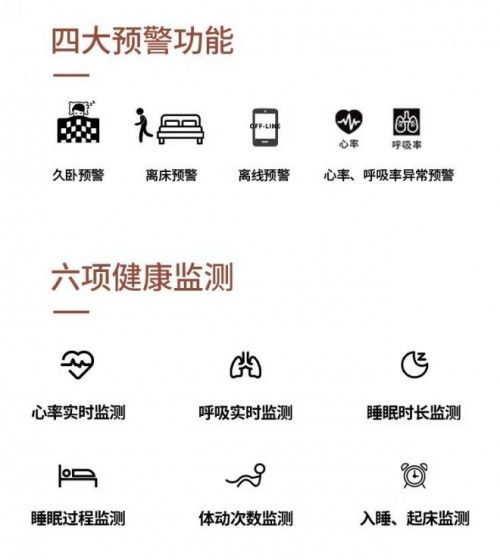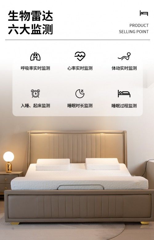 ??360°呵護(hù)模式:四大預(yù)警、六大健康監(jiān)測 ??誼瑞“菁選-破曉”智能真皮電動床,不單是讓你睡得快,睡得好,更加能讓你睡得安全,特別是老年人和長期因?yàn)閴毫喗】档闹心耆巳?,睡眠時(shí)間長,如何能夠清晰明了的知道自己夜晚的各項(xiàng)健康指數(shù)成了急需解決的問題,誼瑞“菁選-破曉”智能真皮電動床采用整晚360°監(jiān)測體系,確保睡眠安全: