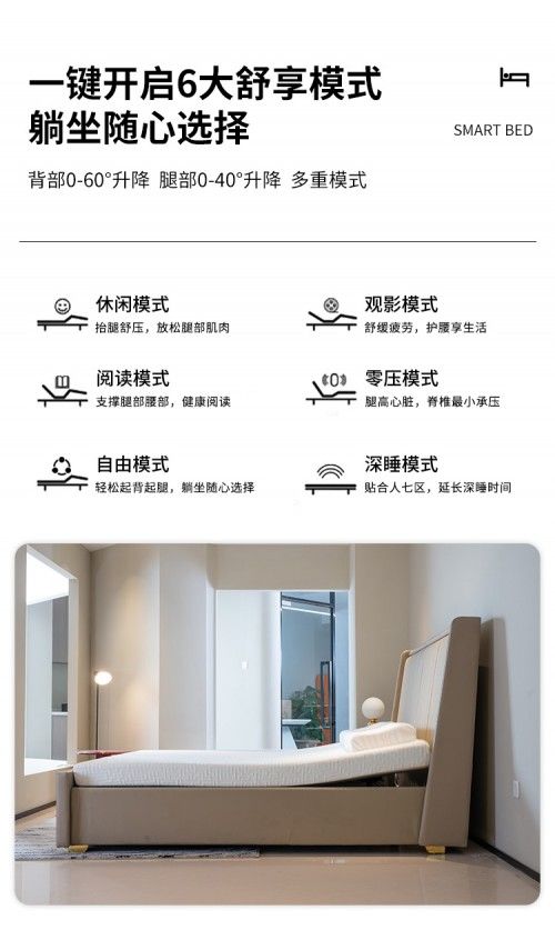 ??智能模式:慵懶享受型,各種休閑活動都體貼 ??更何況,誼瑞“菁選-破曉”智能真皮電動床可根據(jù)個(gè)人需求調(diào)整床的高度,它會自動保存設(shè)置,省去了反復(fù)調(diào)節(jié)的步驟。要知道,這款電動床內(nèi)置雙電機(jī)升降系統(tǒng),可單獨(dú)調(diào)節(jié)腿部和背部。