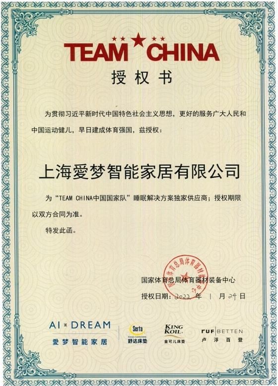 2022年1月24日,愛夢集團(tuán)攜旗下Serta舒達(dá)、KINGKOIL金可兒、RUF Betten盧浮百登三大品牌,獲得國家體育總局體育器材裝備中心授權(quán)許可,正式成為TEAM CHINA中國國家隊(duì)睡眠解決方案獨(dú)家供應(yīng)商,為70余支單項(xiàng)國家隊(duì)隊(duì)伍和運(yùn)動員提供智能睡眠寢具、深度睡眠解決方案。