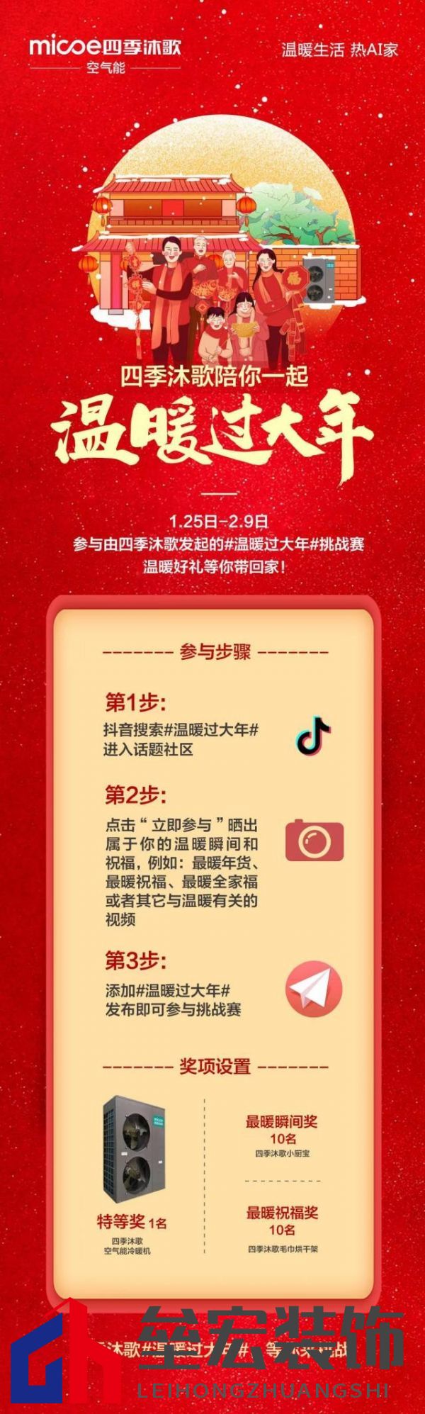 ??喜迎新年,暖字當(dāng)先。在辭舊迎新的隆冬時節(jié),一切自然都要圍繞著一個“暖”字展開才應(yīng)節(jié)應(yīng)景,#溫暖過大年#顧名思義更是如此,不僅參與方式緊扣“暖”字,獎項設(shè)置更是與“暖”字息息相關(guān)。在1月27日-2月9日活動期間,所有參與者都將有機會獲得不同獎項,最暖瞬間獎10名,各獎勵四季沐歌小廚寶一臺;最暖祝福獎10名,各獎勵四季沐歌毛巾烘干架一臺;而作為令人矚目的特等獎得主,則將獲得四季沐歌空氣能冷暖機一臺。年味隨暖心而升溫,新春禮贈種種福利,自上線以來,#溫暖過大年#抖音區(qū)域挑戰(zhàn)賽引得眾多抖音達人紛紛種草,廣大參與者的熱情更是掀起了一波新的高潮。