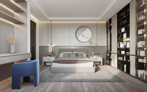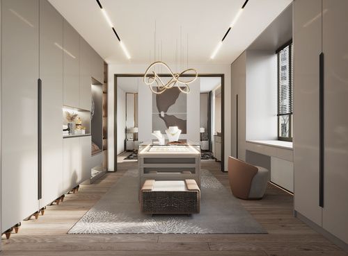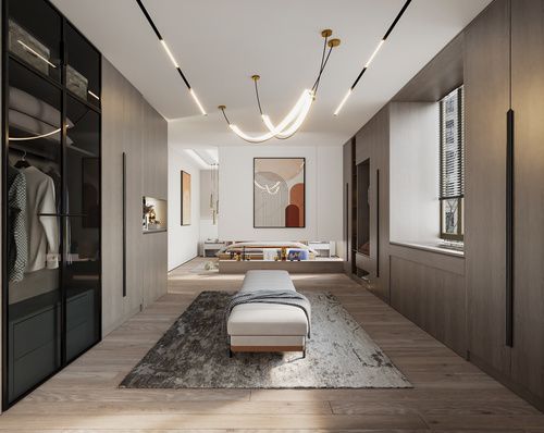 男士衣帽間設(shè)計(jì)是一種沉浸式享受,壁櫥式的輕便收納搭配淺色系的座椅,衣物在輕透的玻璃飾面呈現(xiàn),完美的呈現(xiàn)出主人精致的生活質(zhì)感,淺色系的木質(zhì)地板巧妙地與造型別致的燈具呼應(yīng),空間藝術(shù)感令人贊不絕口,色調(diào)柔和溫馨的壁畫和燈光注入了自在閑適的氛圍。