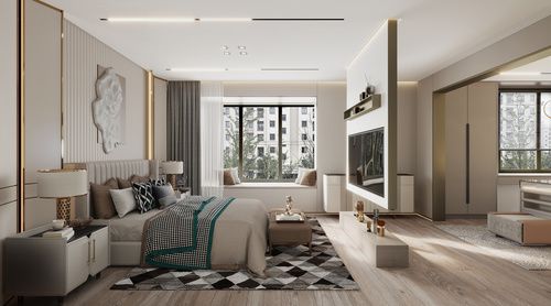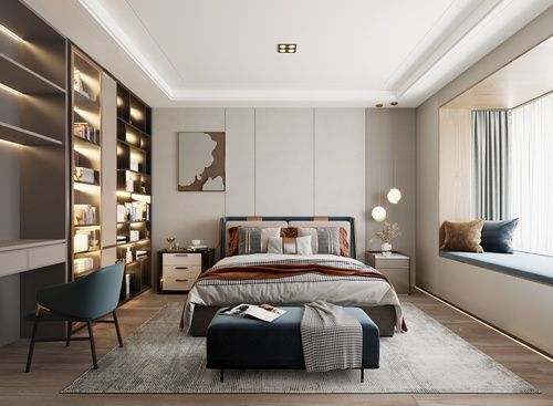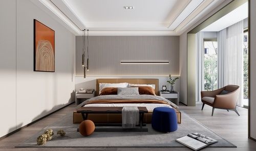 灰白色的墻面上的一抹橘色為男主人房注入了活力和力量,與暖色系的床上用品擺設(shè)遙相呼應(yīng),看似錯(cuò)亂卻井然有序的擺放,大大的落地窗讓自然光照進(jìn)室內(nèi),讓臥室空間看起來寬敞明亮之余,更添寧靜雅致的休憩氛圍,用設(shè)計(jì)展現(xiàn)對生活的美好向往。