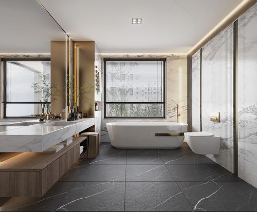 主衛(wèi)的設(shè)計(jì)尤為突出,以純白色為主調(diào),窗戶上疊加了百葉窗元素,自然光能夠照進(jìn)來還能有保留私人空間,實(shí)用性和美觀合二為一。水墨畫底色的背景墻壁緩解了視覺的審美疲勞,開放式的浴缸和馬桶設(shè)計(jì),溫和的燈光增添了白色洗手臺(tái)和收藏柜中間的鏤空美感,黑色花紋的地面帶來幾分踏實(shí),令人身心放松。