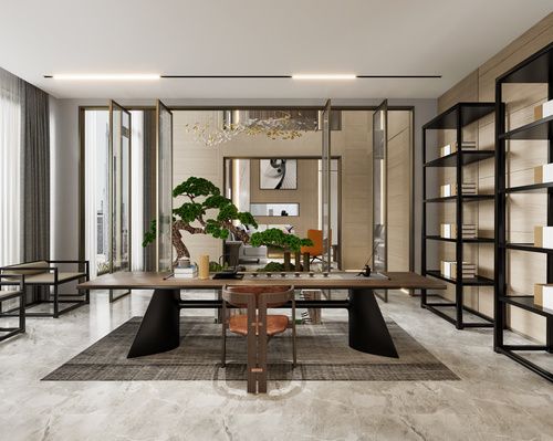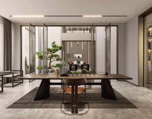 位于一層的茶室書房是房主人的最愛,眼前觀景樹一抹新綠撞上了人們的心頭,讓人如沐春風(fēng)心情愉悅,茶室的清新自然呼之欲出??諘玳_闊的空間融合了光影與質(zhì)感,棕色系的茶桌與深色系茶具讓整個(gè)室內(nèi)氣氛靈動(dòng)而不失格調(diào),擺放整齊的名家書作為茶室增添了不少沉穩(wěn)內(nèi)斂之氣。