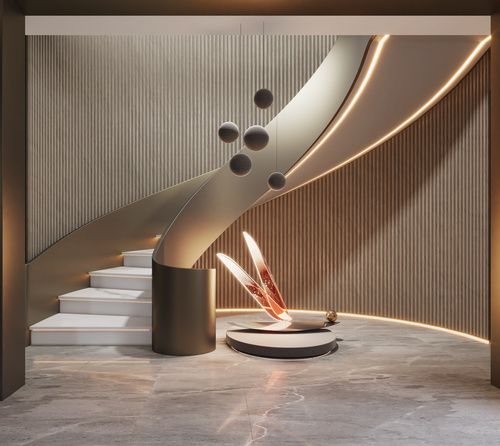 栗木色墻板/全銅整板以及柔美舒適的燈光打造出層次分明的樓梯間,光影交錯(cuò)讓空間多了許多變化和驚喜。樓梯不僅在建筑房屋空間上起到了起承轉(zhuǎn)合的作用,而且遠(yuǎn)觀猶如一條線條柔美流暢的絲帶,是藝術(shù)性的點(diǎn)睛之筆提高了空間的整體氣質(zhì)。