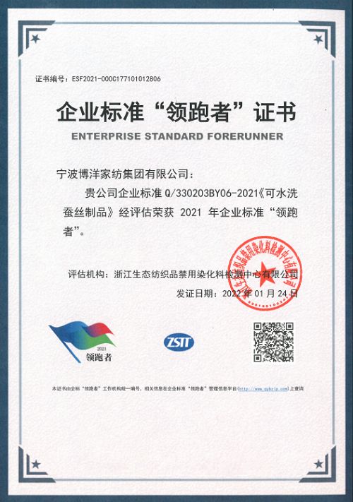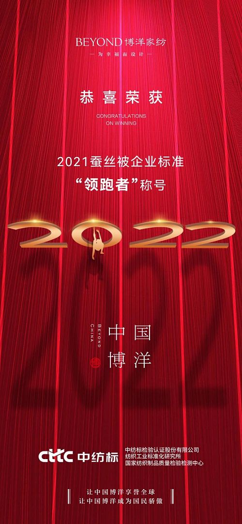 ??近日,國家紡織制品質(zhì)量監(jiān)督檢驗(yàn)中心CTTC中紡標(biāo)公布2021蠶絲被企業(yè)標(biāo)準(zhǔn)“領(lǐng)跑者”名單。憑借遠(yuǎn)高于國家標(biāo)準(zhǔn)的產(chǎn)品質(zhì)量,博洋家紡榜上有名。
