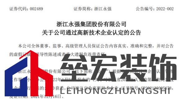 1月26日,浙江永強(qiáng)發(fā)布《關(guān)于公司通過高新技術(shù)企業(yè)認(rèn)定的公告》,稱浙江永強(qiáng)集團(tuán)股份有限公司(以下簡(jiǎn)稱“公司”)根據(jù)全國(guó)高新技術(shù)企業(yè)認(rèn)定管理 工作領(lǐng)導(dǎo)小組辦公室2022年1月24日發(fā)布的《關(guān)于對(duì)浙江省2021年認(rèn)定的第一批高新技 術(shù)企業(yè)進(jìn)行備案的公告》獲悉,公司被認(rèn)定為高新技術(shù)企業(yè)。 1、證書編號(hào)::GR202133005678 2、發(fā)證日期:2021年12月16日 3、有效期:3年 對(duì)公司的影響: 根據(jù)國(guó)家相關(guān)規(guī)定,公司自本次通過高新技術(shù)企業(yè)認(rèn)定后連續(xù)三年(2021年至2023年)可享受國(guó)家關(guān)于高新技術(shù)企業(yè)的稅收優(yōu)惠政策,即按15%的稅率繳納企業(yè)所得稅。公司獲得高新技術(shù)企業(yè)認(rèn)定后,原企業(yè)所得稅稅率從25%調(diào)整為15%,對(duì)公司未來年度經(jīng)營(yíng)狀況將產(chǎn)生積極影響。 四、江山歐派:全資子公司江山花木匠家居有限公司 1月25日,江山歐派發(fā)布《關(guān)于全資子公司通過高新技術(shù)企業(yè)認(rèn)定的公告》。