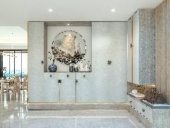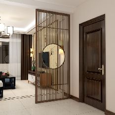 2.進(jìn)門(mén)見(jiàn)餐廳 如果進(jìn)門(mén)是餐廳的話,可以將玄關(guān)柜和餐邊柜設(shè)計(jì)為一體式組合柜,L型設(shè)計(jì)既化解了轉(zhuǎn)角墻體的尷尬,也充分利用了空間,解決了進(jìn)門(mén)空間的收納難題,組合式柜體風(fēng)格統(tǒng)一,還增強(qiáng)了美觀性。定時(shí)餐邊柜時(shí),柜體中部最好挖空,可以用來(lái)當(dāng)水吧,放置水杯、水壺等雜物。 二、隔斷 進(jìn)門(mén)見(jiàn)廳總是有“一覽無(wú)余”的尷尬,主人的隱私也得不到保障,即使戶(hù)型沒(méi)有自帶玄關(guān),很多人也會(huì)利用各種方式進(jìn)行隔斷。 1.普通隔斷 普通隔斷性?xún)r(jià)比高,安裝也很方便,基本上不會(huì)受戶(hù)型影響,是很多家庭的第一選擇。普通隔斷一般分為木質(zhì)隔斷、鐵藝隔斷和玻璃隔斷,可以根據(jù)不同的家裝風(fēng)格選擇不同材質(zhì)的隔斷,美觀大氣,也不會(huì)影響室內(nèi)采光。