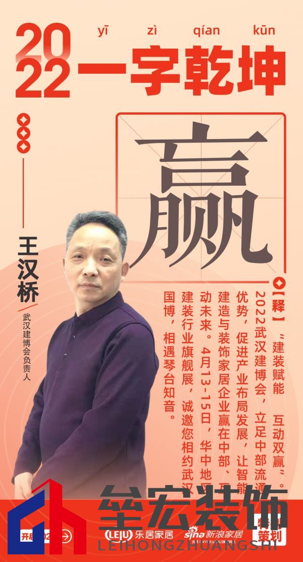 “樂(lè)業(yè)安居”是中國(guó)人最為共情之處,湖北家居人深諳漢字對(duì)于國(guó)人、對(duì)于企業(yè)的非凡意義,武漢新浪家居戰(zhàn)略合作伙伴、家居行業(yè)優(yōu)秀代表:武漢建博會(huì)負(fù)責(zé)人王漢橋,以「贏」字打開(kāi)新年儀式感。 “建裝賦能,互動(dòng)雙贏”。2022武漢建博會(huì),立足中部流通優(yōu)勢(shì),促進(jìn)產(chǎn)業(yè)布局發(fā)展,讓智能建造與裝飾家居企業(yè)贏在中部、互動(dòng)未來(lái)。4月13-15日,華中地區(qū)建裝行業(yè)旗艦展,誠(chéng)邀您相約武漢國(guó)博,相遇琴臺(tái)知音。「贏」字完美表達(dá)了2022年武漢建博會(huì)的愿景。 虎歲賁華,說(shuō)好中國(guó)字,鏈接美好生活! |