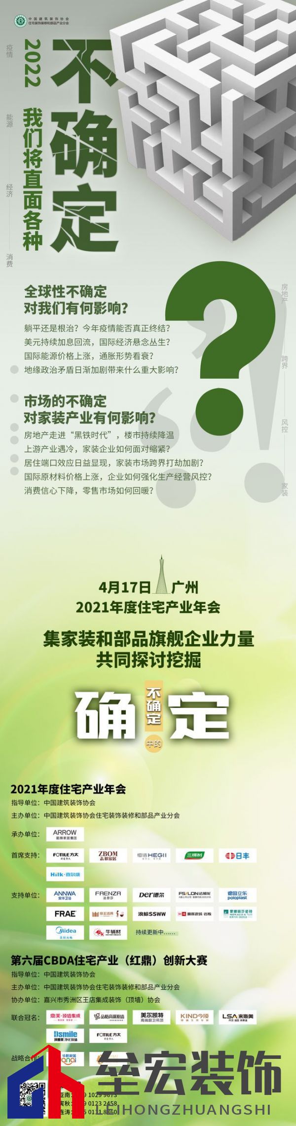 據(jù)68家A股建筑裝飾企業(yè)2021年業(yè)績預(yù)告,32家歸母凈利潤虧損,占比約47%。地產(chǎn)至暗,公裝普虧,家裝成了產(chǎn)業(yè)新風(fēng)口。2021年,家裝賽道大鱷紛紛入局資本密集涌入,行業(yè)生態(tài)面臨重構(gòu)。 資源端:大廠入局資本涌入—傳統(tǒng)裝企能否守好自己的一畝三分地? 公裝企業(yè)與房地產(chǎn)牽連至深,2021年度歸屬于上市公司股東的凈利潤均為負(fù)值,紛紛向房企提起訴訟、建材企業(yè)密集追債,在這種局勢(shì)下,家裝渠道關(guān)注度顯著提升,地產(chǎn)、物業(yè)、互聯(lián)網(wǎng)紛紛并道家裝,面對(duì)更多的跨界打劫,傳統(tǒng)裝企能把住多少基本盤? 2021混戰(zhàn)已去,2022局勢(shì)依舊迷離。 帶著這些“不確定”標(biāo)簽,我們邁入了2022年。 在這一年里,我們要面對(duì)延宕至第三個(gè)年頭的新冠疫情,面對(duì)西方國家取消全面防疫措施徹底躺平的風(fēng)險(xiǎn)難控; 在這一年里,我們還要面對(duì)國內(nèi)經(jīng)濟(jì)需求收縮、供給沖擊、預(yù)期轉(zhuǎn)弱三重壓力,面對(duì)宏觀經(jīng)濟(jì)和微觀市場諸多不確定。 當(dāng)中國發(fā)展從數(shù)量時(shí)代進(jìn)入到質(zhì)量時(shí)代,什么樣的產(chǎn)品可以撐得起品質(zhì)家裝? 當(dāng)增量市場風(fēng)光不再,家裝的第二增長曲線在哪個(gè)坐標(biāo)系中? 當(dāng)各部委連續(xù)出臺(tái)8個(gè)文件@家裝圈,圈里人做好承接準(zhǔn)備了嗎? 當(dāng)家裝已經(jīng)成為家庭大宗消費(fèi)代表,如何滿足家裝需求?落地生活方式? 4月17日(視疫情情況)廣州,2021年度住宅產(chǎn)業(yè)年會(huì), 此次會(huì)議,將首發(fā)《2021年度中國家裝消費(fèi)行為研究報(bào)告——“整裝”出發(fā)》,也將第首次發(fā)布《中國家裝設(shè)計(jì)趨勢(shì)》; 此次會(huì)議,年會(huì)首次牽手紅鼎創(chuàng)新大賽,13家家裝企標(biāo)“領(lǐng)跑者”企業(yè)、33家信用評(píng)價(jià)星級(jí)企業(yè)、72個(gè)室內(nèi)設(shè)計(jì)TOP作品、57個(gè)部品工業(yè)設(shè)計(jì)TOP作品迎來高光時(shí)刻; 此次會(huì)議,家裝和部品旗艦企業(yè)將共同在復(fù)雜局勢(shì)中合力尋找杠桿解,探討挖掘“不確定”中的“確定”。