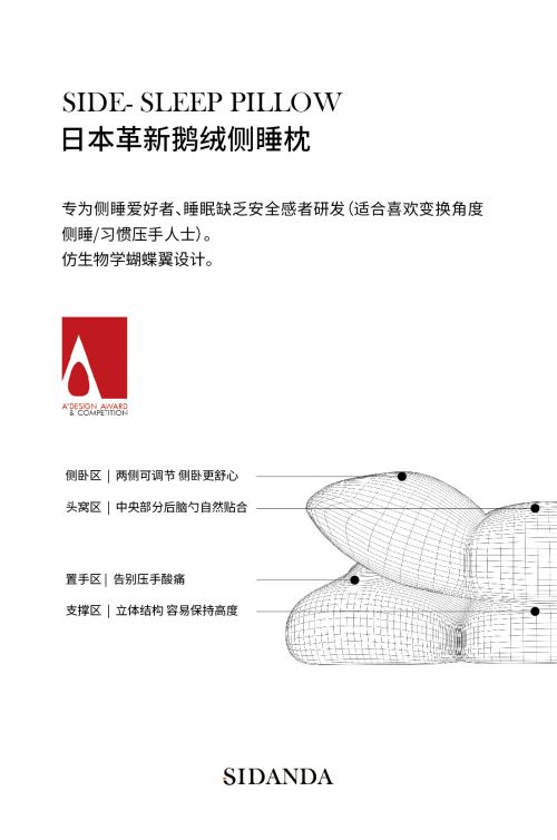 仿生學(xué)蝴蝶翼設(shè)計(jì),為頭部提供溫暖包裹與安全感。分體式設(shè)計(jì)更充分考慮到側(cè)睡時(shí)常見(jiàn)的壓手問(wèn)題。使用者可以輕松將手插入枕頭間的縫隙,避免長(zhǎng)時(shí)間把手壓在頭下導(dǎo)致的酸麻、疼痛。 再一次摘得世界級(jí)設(shè)計(jì)大獎(jiǎng),是對(duì)SIDANDA堅(jiān)持深耕睡眠美學(xué),不忘初心的高度肯定;也是激勵(lì)品牌持續(xù)創(chuàng)新,大膽解構(gòu)的不竭動(dòng)力。