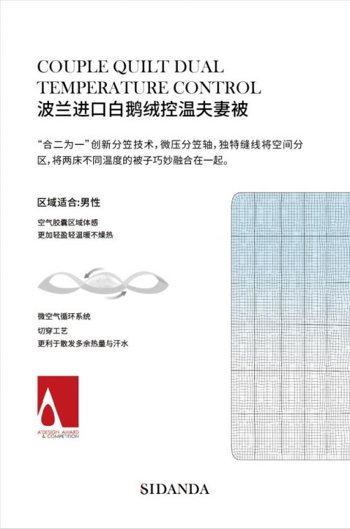 “波蘭進(jìn)口95白鵝絨控溫夫妻被”是SIDANDA針對(duì)夫妻同床一被時(shí),男女雙方對(duì)溫度的感知不同,且有可能因翻身漏風(fēng)而困擾的情況開(kāi)發(fā)。產(chǎn)品真正實(shí)現(xiàn)一床被子兩種溫度的雙區(qū)控溫,根據(jù)兩性之間新陳代謝的不同,達(dá)到相互舒適的目的。