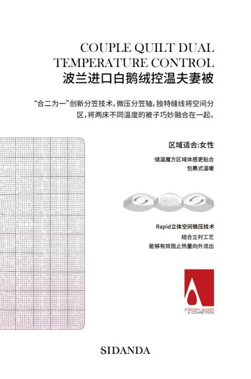 | 創(chuàng)意驅(qū)動(dòng)靈感,設(shè)計(jì)重釋睡眠!SIDANDA科學(xué)睡眠系列產(chǎn)品——波蘭進(jìn)口95白鵝絨控溫夫妻被及日本革新鵝絨側(cè)睡枕同時(shí)斬獲意大利A’Design Award。成為2020年度國(guó)內(nèi)唯一獲得意大利A’Design Award家居類(lèi)獎(jiǎng)的羽絨床品品牌。