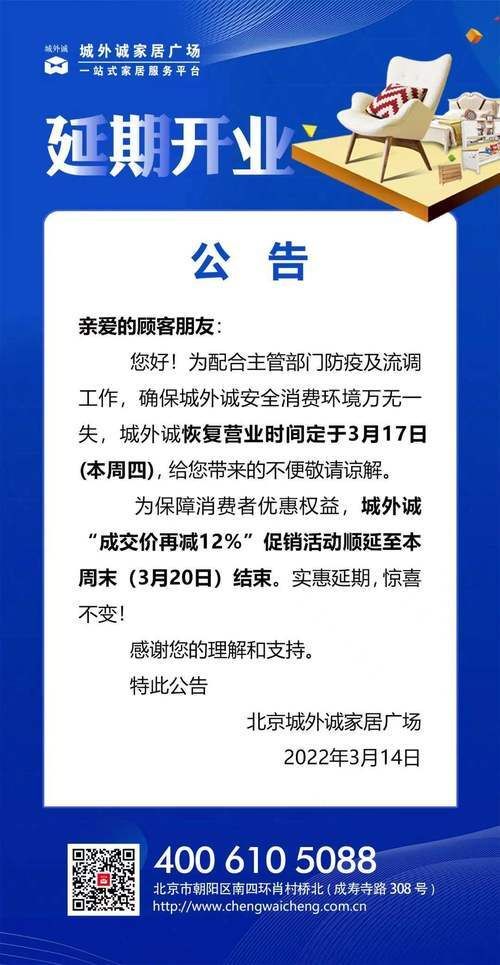 ??新浪家居訊 3月14日,城外誠(chéng)家居廣場(chǎng)發(fā)布公告稱,為配合主管部門(mén)防疫及流調(diào)工作,確保城外誠(chéng)安全消費(fèi)環(huán)境萬(wàn)無(wú)一失,商場(chǎng)將于3月17日恢復(fù)營(yíng)業(yè)。同時(shí)表示,“成交價(jià)再減12%”促銷(xiāo)活動(dòng)將順延至3月20日結(jié)束。