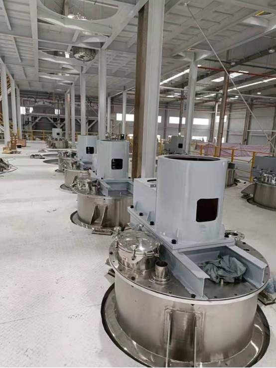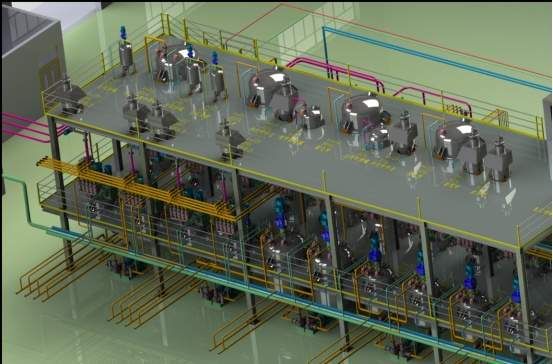 ??(產(chǎn)線(xiàn)三維模型圖) ??(3D model drawing of production line) ??系統(tǒng)特點(diǎn):System characteristics ??1、粉體投料系統(tǒng)無(wú)塵化、自動(dòng)化,自帶過(guò)濾濾芯及除塵系統(tǒng),粉體補(bǔ)料過(guò)程中無(wú)粉塵飛揚(yáng);粉體根據(jù)配方需求全自動(dòng)配料;極大的降低人工成本和改善工作環(huán)境; ??The powder feeding system is dust-free and automatic, with its own filter element and dust removal system, and there is no dust flying in the process of powder feeding. The powder is fed automatically according to the formula and greatly reducing labor costs and improving the working environment. ??2、根據(jù)高粘度的物料特性,特殊設(shè)計(jì)混合攪拌結(jié)構(gòu),超高效混合,生產(chǎn)罐及調(diào)色罐真空設(shè)計(jì)壓力為100pa; ??According to the characteristics of high viscosity materials, the mixing structure is specially designed for ultra efficient mixing. The vacuum design pressure of production tank and color mixing tank is 100Pa. ??3、B組分生產(chǎn)罐采用專(zhuān)色專(zhuān)罐,免清洗,無(wú)液廢、固廢; ??The production tank of component B uses different tanks for each color, which is free of cleaning and liquid & solid waste. ??4、高效智能,自動(dòng)化程度高,具備一鍵啟動(dòng)條件;液體配料及物料轉(zhuǎn)移根據(jù)配方需求全自動(dòng)運(yùn)行; ??High efficiency, high degree of automation, with one-key start condition.Liquid batching and material conveying are fully automatic operated according to formula. ??5、成品采用恒壓系統(tǒng)泵送至灌裝機(jī),這個(gè)輸送過(guò)程全部在密閉的管道中進(jìn)行,與全自動(dòng)灌裝機(jī)聯(lián)動(dòng)。 ??The finished product is pumped to the filling machine by a constant pressure system. This conveying process is all carried out in a closed pipeline, which is linked with the automatic filling machine. ??目前項(xiàng)目正在安裝進(jìn)行中 ??At present, the project is under installation