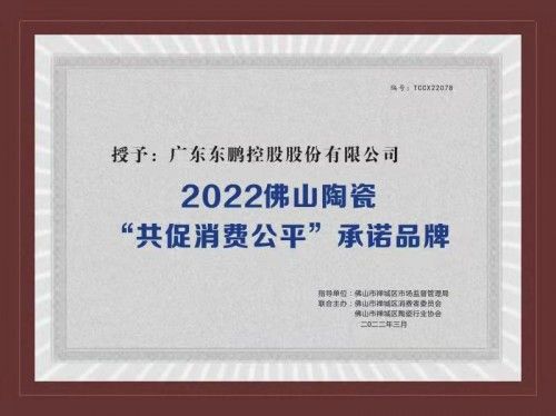 3月15日,為大力宣傳綠色產(chǎn)品(陶瓷)認證政策,推動我市綠色產(chǎn)品發(fā)展,由佛山市市場監(jiān)督管理局主辦,佛山市禪城區(qū)陶瓷行業(yè)協(xié)會協(xié)辦的“2022年佛山綠色產(chǎn)品(陶瓷)認證政策宣貫會及“共促消費公平”會議,東鵬控股榮獲2022佛山陶瓷百家“共促消費公平”承諾品牌授牌。