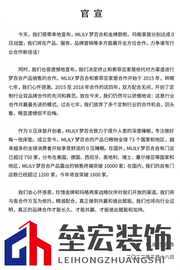家居企業(yè)促進(jìn)家居行業(yè)消費(fèi)公平,有很多維度和發(fā)力點(diǎn),比如,運(yùn)用科技的力量變革家居家裝,同時(shí)用向善的企業(yè)文化引導(dǎo)科技向善而行;比如,不忘初心,在綠色環(huán)保低碳上下功夫;比如,讓更廣大的消費(fèi)群體享受到更高品質(zhì)的產(chǎn)品和服務(wù)等等。3月15日,國(guó)際消費(fèi)者權(quán)益日到來(lái)之際,由搜狐焦點(diǎn)家居主辦的以“共促家居消費(fèi)公平”為主題的對(duì)話沙龍舉辦,北上廣三地、聚焦三大議題、九位行業(yè)大咖進(jìn)行連線,共同探討如何有效解決家居行業(yè)“頑疾”,給消費(fèi)者吃顆“定心丸”?!贰贰伏c(diǎn)擊進(jìn)入詳情頁(yè) 05 《住宅室內(nèi)裝飾裝修工程施工驗(yàn)收規(guī)范》 團(tuán)體標(biāo)準(zhǔn)正式發(fā)布 3月14日,天津市消費(fèi)者協(xié)會(huì)會(huì)同天津市室內(nèi)裝飾協(xié)會(huì)、天津市家居商會(huì)聯(lián)合發(fā)布《住宅室內(nèi)裝飾裝修工程施工驗(yàn)收規(guī)范》團(tuán)體標(biāo)準(zhǔn),該標(biāo)準(zhǔn)將為規(guī)范住宅室內(nèi)裝飾裝修工程施工質(zhì)量與驗(yàn)收提供參考依據(jù)。 據(jù)悉,為了進(jìn)一步規(guī)范住宅裝飾裝修企業(yè)經(jīng)營(yíng)行為、加強(qiáng)行業(yè)自律、維護(hù)消費(fèi)者合法權(quán)益,天津市消費(fèi)者協(xié)會(huì)、天津市家居商會(huì)、天津市室內(nèi)裝飾協(xié)會(huì)共同提出,天津陽(yáng)光力天裝飾科技集團(tuán)有限公司、天津業(yè)之峰裝飾有限公司等31家企業(yè)共同參與制定了《住宅室內(nèi)裝飾裝修工程施工驗(yàn)收規(guī)范》團(tuán)體標(biāo)準(zhǔn)。 06 三天8省超30家陶企漲價(jià)! 江西湖南湖北河南河北云南安徽…… 據(jù)《陶瓷信息》不完全統(tǒng)計(jì),3月10-3月12日,短短三天時(shí)間,江西、湖南、湖北、河南、河北、云南、安徽、廣東等省份超過(guò)30家陶企的瓷磚/陶瓦漲價(jià)函從微信朋友圈流出,漲價(jià)品類涵蓋仿古磚、拋光磚、拋釉磚、瓷片等,漲幅普遍達(dá)到1~2元/㎡。今年開(kāi)年至3月9日期間,盡管原材料價(jià)格不斷上漲,但大部分產(chǎn)區(qū)及陶企瓷磚價(jià)格較為穩(wěn)定,僅有廣東、四川等使用天然氣的陶瓷產(chǎn)區(qū)部分陶企的產(chǎn)品價(jià)格有上調(diào)。 不過(guò),3月10日以后,發(fā)出漲價(jià)通知的陶瓷企業(yè)明顯增多。據(jù)了解,此次漲價(jià)主要與上周煤炭到廠價(jià)突然大漲有關(guān),漲價(jià)陶企使用的燃料基本以煤炭為主。 07 夢(mèng)百合與金牌廚柜、瑪格家居 達(dá)成0壓戰(zhàn)盟 終止與索菲亞的合作 2022年3月18日,MLILY夢(mèng)百合發(fā)布公告,官宣和金牌廚柜、瑪格家居分別達(dá)成0壓戰(zhàn)盟,將在產(chǎn)品、服務(wù)、品牌營(yíng)銷等多方面展開(kāi)全方位合作;同時(shí),遺憾宣布終止和索菲亞家居依托對(duì)方渠道進(jìn)行夢(mèng)百合產(chǎn)品銷售的合作。