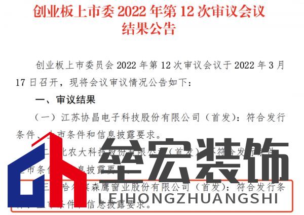 08 森鷹窗業(yè)IPO首發(fā)過(guò)會(huì)! 歐派家居、居然之家等是其股東 3月17日,哈爾濱森鷹窗業(yè)股份有限公司(以下簡(jiǎn)稱“森鷹窗業(yè)”或公司)深圳創(chuàng)業(yè)板IPO首發(fā)過(guò)會(huì),本次上市保薦機(jī)構(gòu)為民生證券,公司計(jì)劃發(fā)行不超過(guò)過(guò)2,370萬(wàn)股,占發(fā)行完成后公司總股本的比例不低于25%;公司擬公開(kāi)募集資金約6.73億元,主要用于哈爾濱年產(chǎn)15萬(wàn)平方米定制節(jié)能木窗建設(shè)項(xiàng)目、南京年產(chǎn)25萬(wàn)平方米定制節(jié)能木窗項(xiàng)目以及補(bǔ)充流動(dòng)資金。