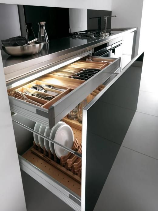 二、鍋碗瓢盆放地柜 現(xiàn)在市面上的地柜可大致劃分為掩門式和抽拉式,主要用來放置鍋具、餐具等大件廚房物品,也可以在內(nèi)嵌入洗碗機(jī)等家電。