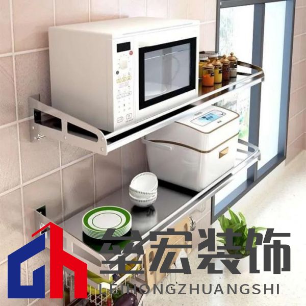 2、廚房置物架 將廚房置物架安裝在灶臺(tái)旁墻面上,不僅能節(jié)省臺(tái)面空間,還可以放置微波爐和燒水壺等小家電,側(cè)面還有掛鉤設(shè)計(jì),可掛放砧板等小物。